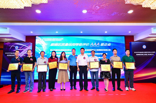 2021年5月7日,佛山市順德區產品質量協會在仙泉酒店組織了“2021年標準化戰略引領NQI體系高質量發展(順德)高峰論壇”,論壇會上特邀請相關政府領導對獲得“佛山市順德區企業質量信用等級評價AAA級”的企業進行頒牌儀式!
