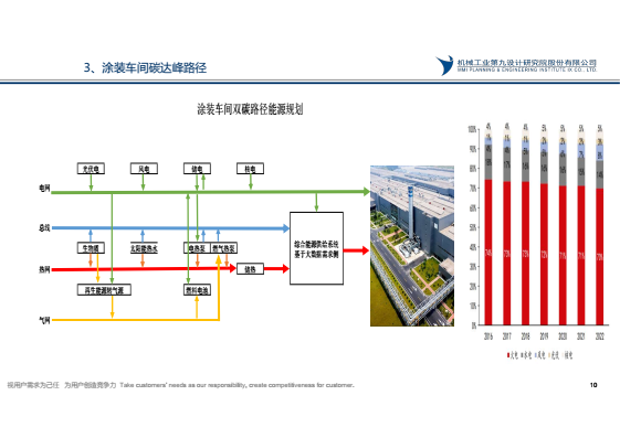 國務院2021年10月24日頒布《2030年前碳達峰行動方案》,到2025年,非化石能源消費比例達到20%左右,單位國內生產總值能源消耗比2020年下降13.5%,單位國內生產總值二氧化碳排放比2020 年下降18%,目前汽車涂裝車間化石能源消費比約占80%,碳排放約占汽車工廠65%,汽車工廠實現碳達峰,涂裝需先行。