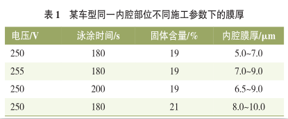 高泳透力電泳涂料在彌補內腔膜厚偏薄方面具有一定的作用,但有些腔體或縫隙因車身造型的原因,涂膜過薄或露底,則應改進車身的結構,采取增開工藝孔或安裝輔助電極等措施來解決涂膜質量問題。同時,泳透力與涂裝工藝參數(泳涂時間、電壓、槽液固體含量等)有直接關系??蛇m當延長泳涂時間、提高泳涂電壓和槽液固體含量,提高槽液泳透力,見表1。