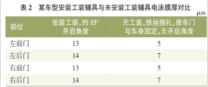 無論是傳統的四門兩蓋車身結構還是小型的兩門兩蓋車身結構,均需要開發工裝輔具來完成車身電泳,其目的不僅是在車身電泳時保證車身無磕碰發生,更重要的是車身在浸入電泳槽液時,開啟一定的角度,促進槽液的流入速度,改善車門內腔在電泳過程中電場的分布,使其迅速成膜,并提高門、蓋內腔電泳漆膜厚度,增強防腐能力。在相同的槽液環境和輸送方式下,對四門進行電泳驗證,驗證結果見表2。