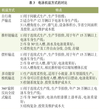 在新工廠規劃設計階段,一般會根據年產量、投資金額等設計輸入,綜合考慮后,對前處理電泳的機運方式及其他工藝設備進行設計選型。前處理電泳機運方式有:自行葫蘆式輸送、推桿鏈式輸送、擺桿鏈式輸送、多功能穿梭機式輸送、360°旋轉反向全浸式輸送。不同的機運方式對車身內腔膜厚也有重大影響,機運方式的選型至關重要,電泳機運方式的對比見表3所列。