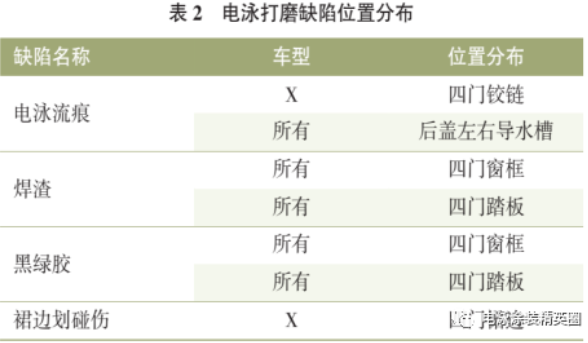 對電泳打磨主要缺陷分別對應的車型、位置分布進行統計(見表2所列),并根據歷史缺陷、現有缺陷的產生原因進行分析,從而為電泳打磨缺陷防治確定針對性方向。