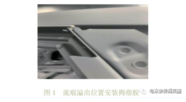 通過觀察電泳流痕,部分流痕是從窗框、鉸鏈等鈑金間隙烘烤后溢出,流淌至鉸鏈、導水槽、B柱等位置,針對此類情況,可在電泳后工位針對電泳流痕固定點溢出的間隙位置采取安裝拇指膠、堵住固定點間隙的方法,以減少電泳流痕的溢出,如圖1所示。