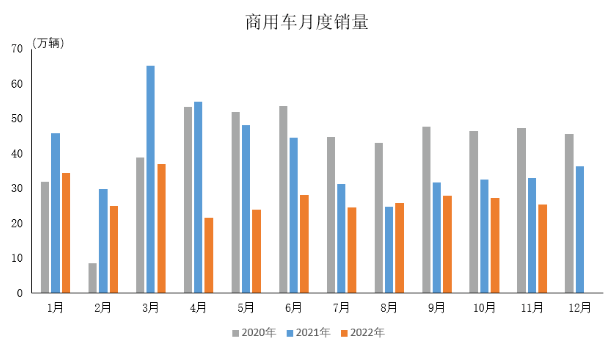 2022年1-11月,商用車產銷分別完成292.7萬輛和301萬輛,同比分別下降31.9%和32.1%,繼續呈現兩位數下滑。