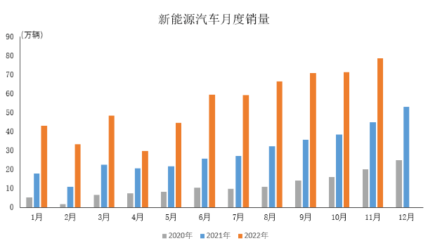 2022年11月,新能源汽車產銷分別完成76.8萬輛和78.6萬輛,同比分別增長65.6%和72.3%。