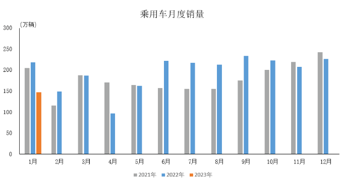 2023年1月,乘用車產銷分別完成139.7萬輛和146.9萬輛,環比分別下降34.3%和35.2%,同比均下降32.9%。