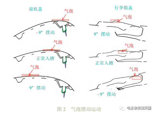通常我們的瀝液孔在前艙內板的最低點,排氣孔會開在內板與外板壓合處的最高點,所以工裝的長度一般要高于兩翼,前艙蓋和后行李箱蓋鉸鏈的開口在30°~40°即可,注意這種角度狀態一定是瀝液孔在最低點處,如果不是最低點,我們可以通過工裝加長或減短來調整瀝液孔的所處位置,同時要滿足鉸鏈的開口在30°~40°,如果超出范圍,申請設計變更增加瀝液孔??梢愿鶕妱雍J輸送系統擺動的原理,當車身擺動時,氣泡會隨著擺動移動位置,讓電泳液在前后蓋內腔充分與前后蓋外板內表面接觸成膜,見圖2。