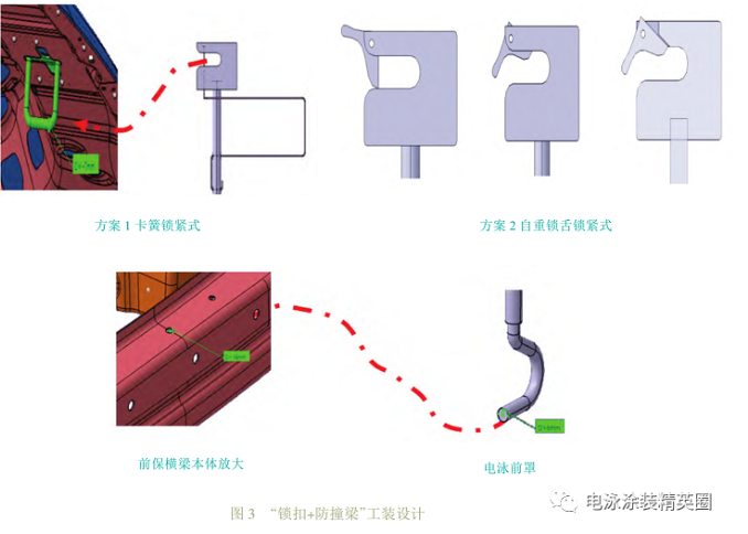 針對通用前艙蓋工裝安裝設計,優先選擇的位置是共有的固定特征或固定位置,一般車型都是焊接式鎖扣,白車身安裝防撞梁過涂裝線,這樣的工裝可以選擇防撞梁和前艙蓋鎖扣固定,為方便員工操作固定方式盡量設計簡單方便,見圖3。