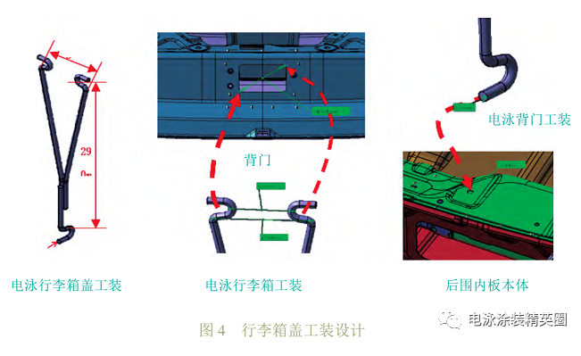 涂裝輔助工裝通常分為前處理電泳工裝和面漆工裝兩種;前處理電泳輔助工裝為限位夾緊類,面漆輔助工裝為支撐類;安裝固定在車身四門、前艙蓋、行李箱蓋位置。