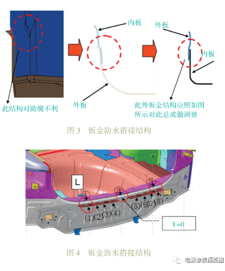 車身防腐結構設計主要包含車身流水結構設計及鈑金搭接設計,車身流水結構設計不佳或者鈑金搭接缺口過大均會導致白車身(焊縫)進水出現銹蝕。