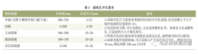 對車身工藝孔設計進行分析,為新車型同步工程中固化的流程,每個主機廠均形成適合自己生產線的詳細開孔方法,此處不再贅述。表 1為鈑金通電孔常見開孔要求。