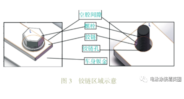 鉸鏈位置的空腔間隙主要來源于兩個方面:一是鉸鏈安裝面和車身板面的貼合間隙,二是鉸鏈和緊固螺栓的配合空腔,此空腔間隙從圖 3 能明顯看出。