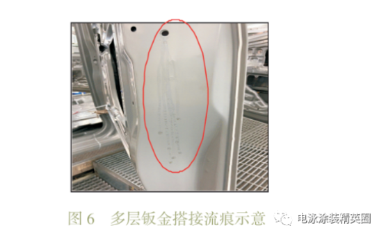 某車型中門區域內板鎖孔位置為門內板和鎖扣加強板通過焊點和結構膠固定,經過前處理電泳后兩層鈑金之間存在電泳殘液,烘烤時從鎖孔位置流出,故障率在50%左右,故障模式如圖 6 所示。